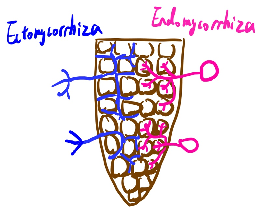 Figure 1: Distinction between ectomycorrhiza and endomycorrhiza. Ectomycorrhiza (blue) doesn’t penetrate the cells, while endomycorrhiza (pink) does.