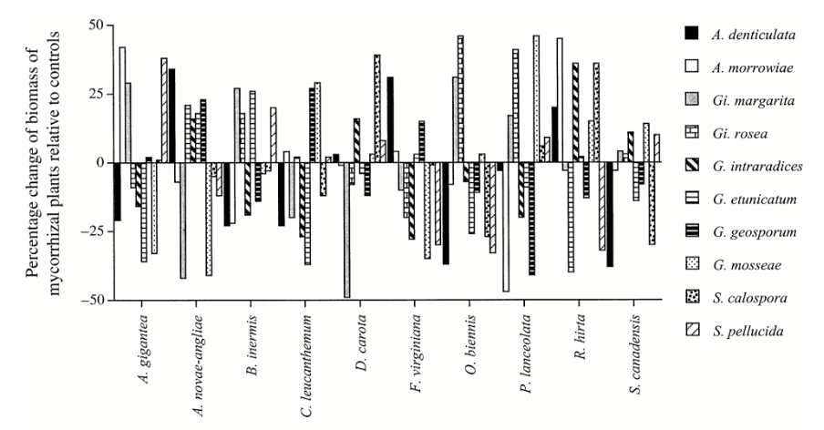 Figure 2: the influence of different AM fungi on the biomass of different plants compared to control that grow without AM fungi. Adapted from Klironomos, 2003.14