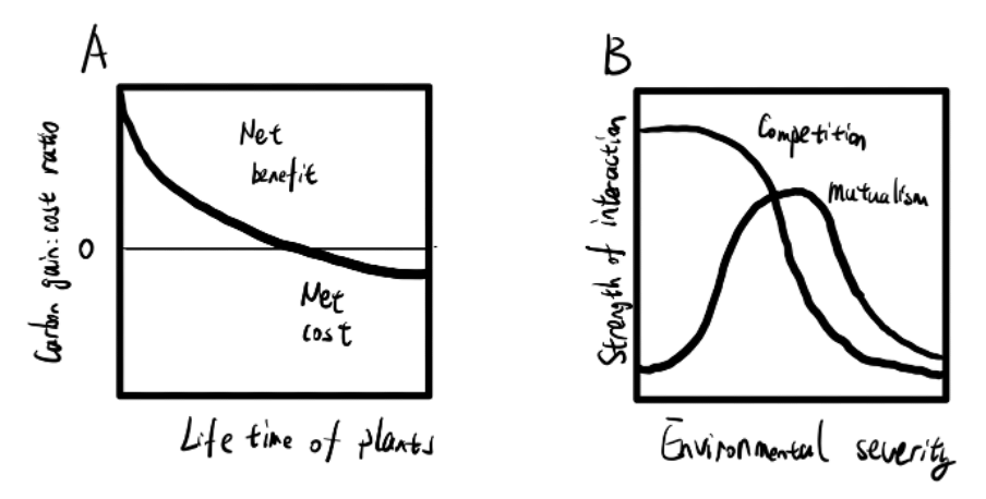 Figure 3: Observed or expected relationship between mycorrhizae and plants under different conditions. (A) Carbon gain and cost over the lifetime of a tree associated with mycorrhizae; (B) Relative strength of interaction under increasing environmental severity. Modified from Butterfield, Bradley J., 2009.(18)